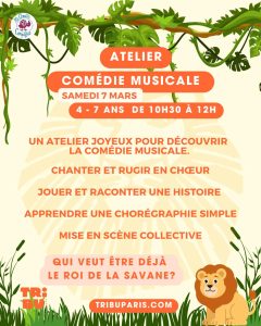Découvrez la comédie musicale le 7 mars de 10h30 à 12h : danse, chant et comédie. Vos enfants se sentiront comme un artiste de broadway !